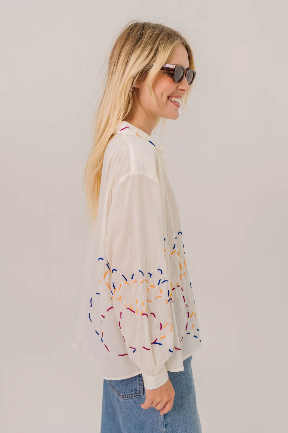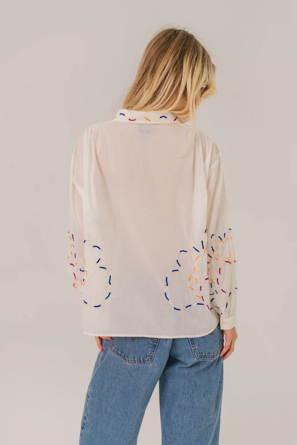 Blouse à manches longues brodée, confectionnée dans un voile de coton léger. Coupe ample et aérienne, col chemise classique. Des fronces délicates aux épaules et aux poignets apportent une touche de féminité.