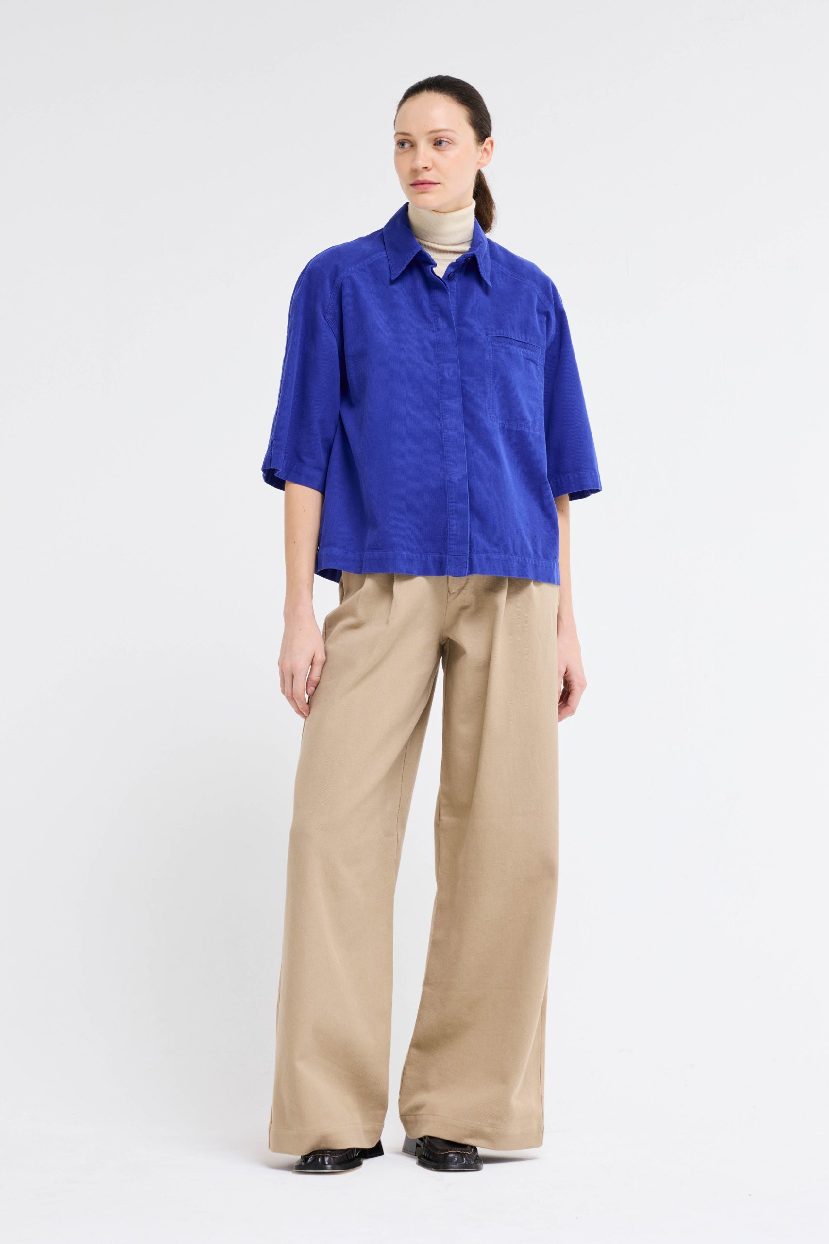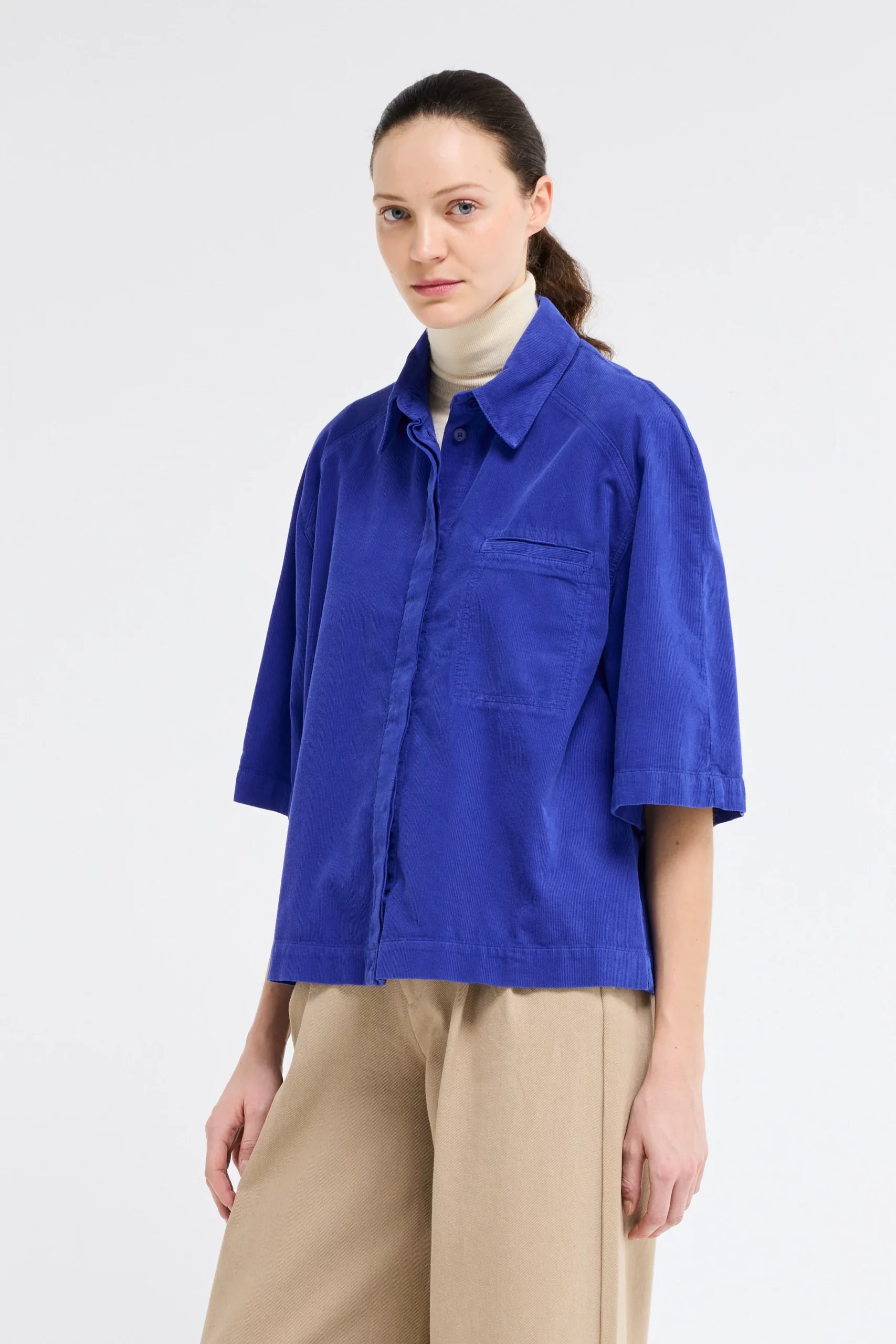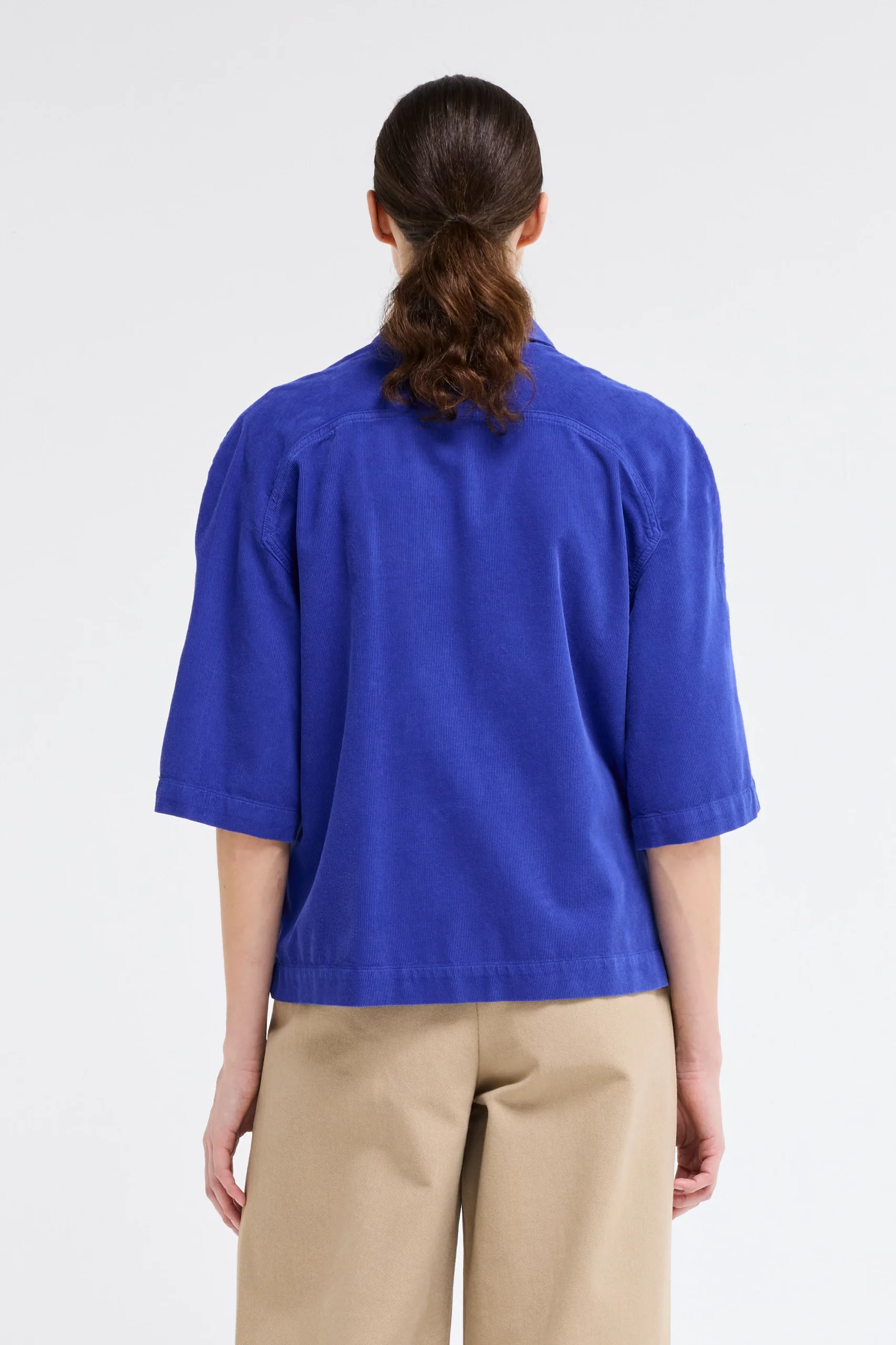 Une chemise courte boutonnée à la coupe carrée et moderne. Ses manches au coude et sa poche poitrine unique lui confèrent une allure épurée et structurée. Elle se porte aussi bien seule qu’en superposition.