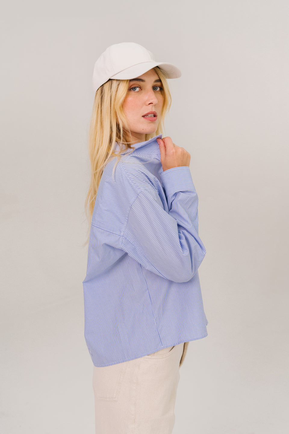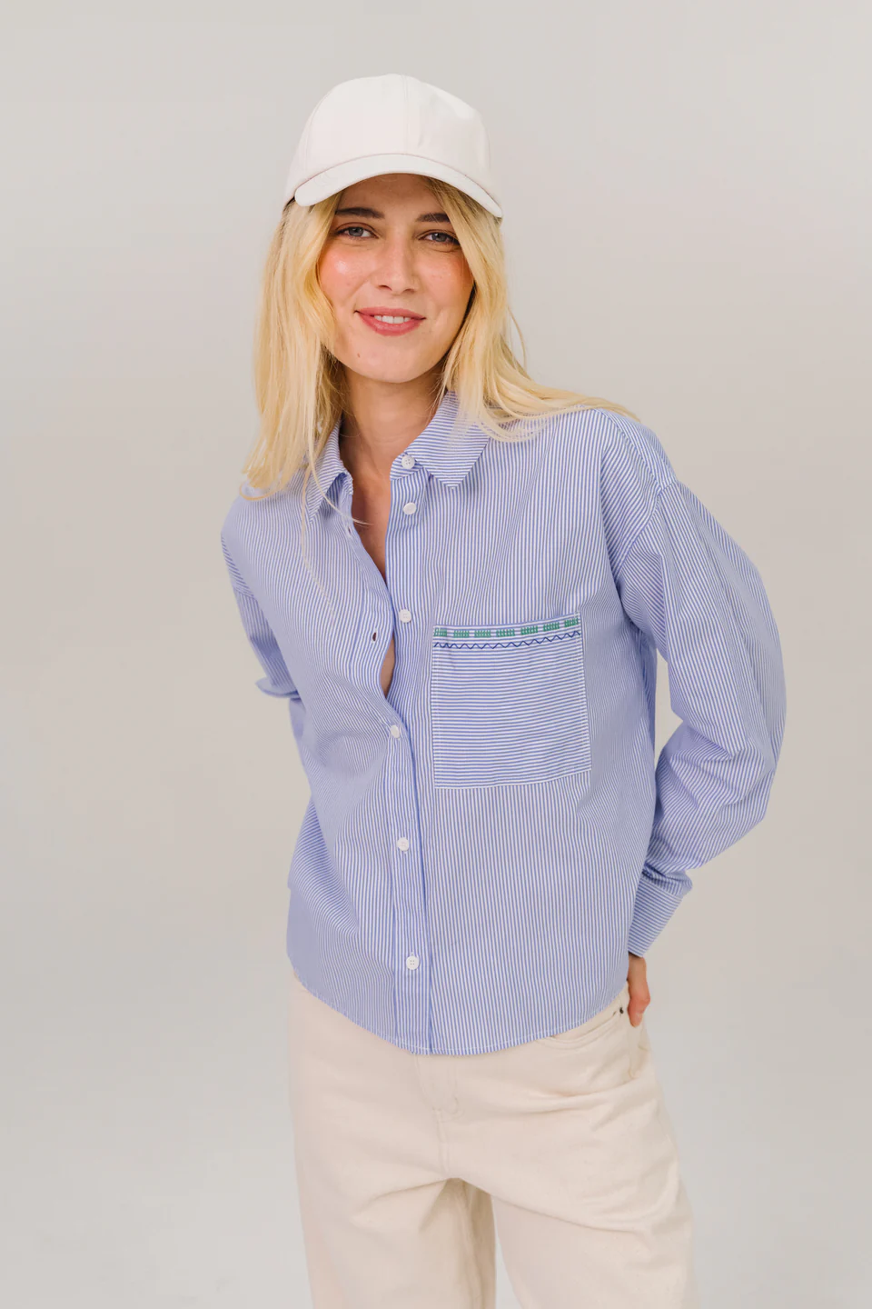 Chemise courte à manches longues en popeline de coton, coupe légèrement oversize inspirée du vestiaire masculin. Poche poitrine plaquée ornée d’une broderie multicolore. Col chemise classique, boutonnage apparent et poignets boutonnés pour une allure à la fois affirmée et décontractée.