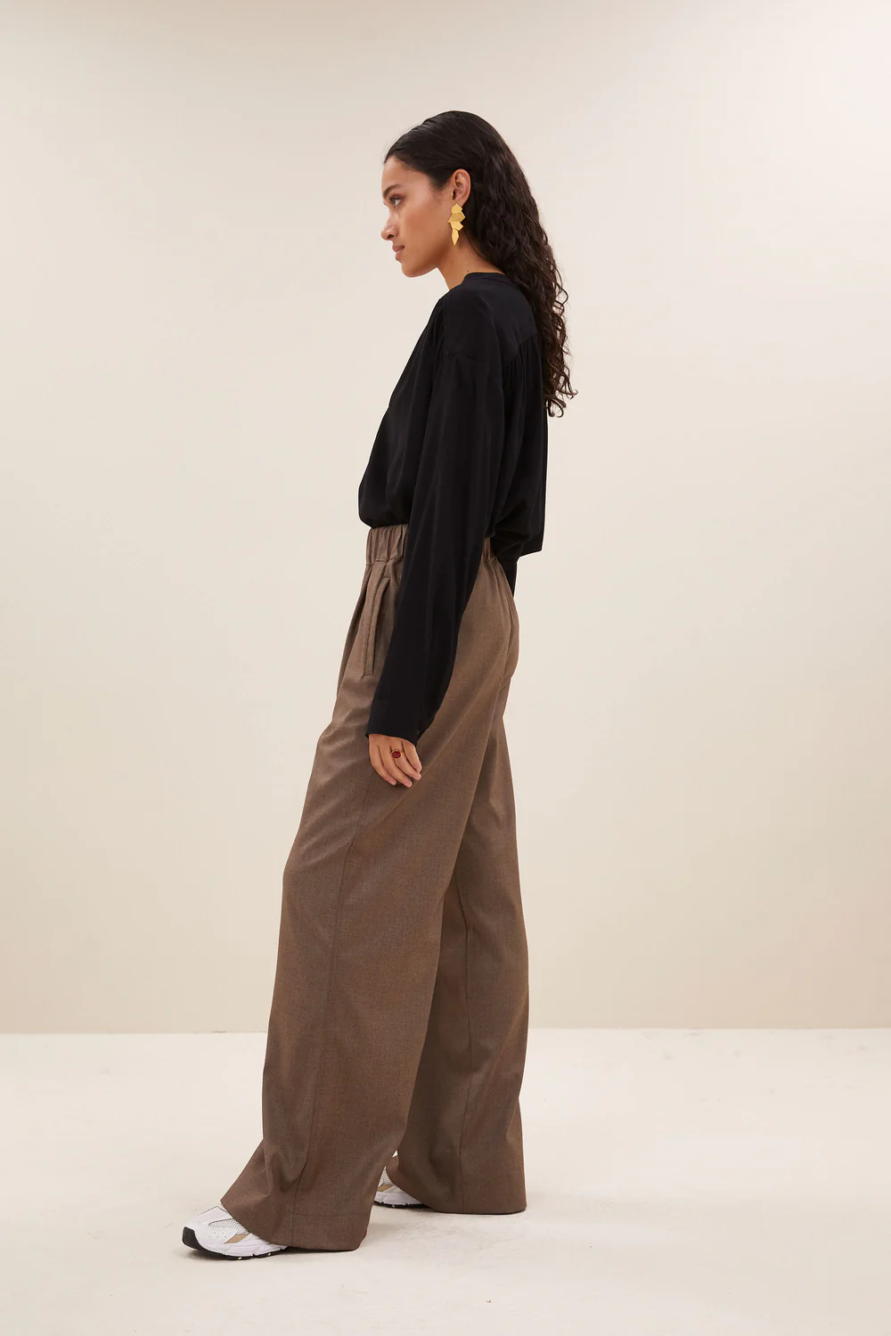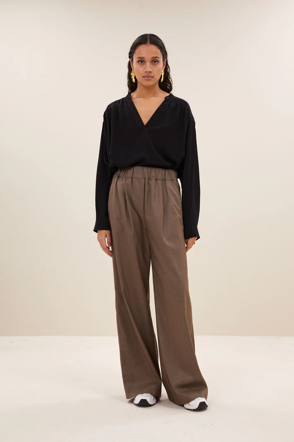 Le pantalon Benji biscuit allie confort et style avec une coupe ample et une taille haute parfaitement ajustée. Grâce à la ceinture élastique et aux détails plissés, vous profitez d’un look décontracté sans effort. La longueur longue du pantalon et les poches latérales pratiques rendent ce pantalon idéal pour tous les jours, où confort et facilité sont au rendez-vous.