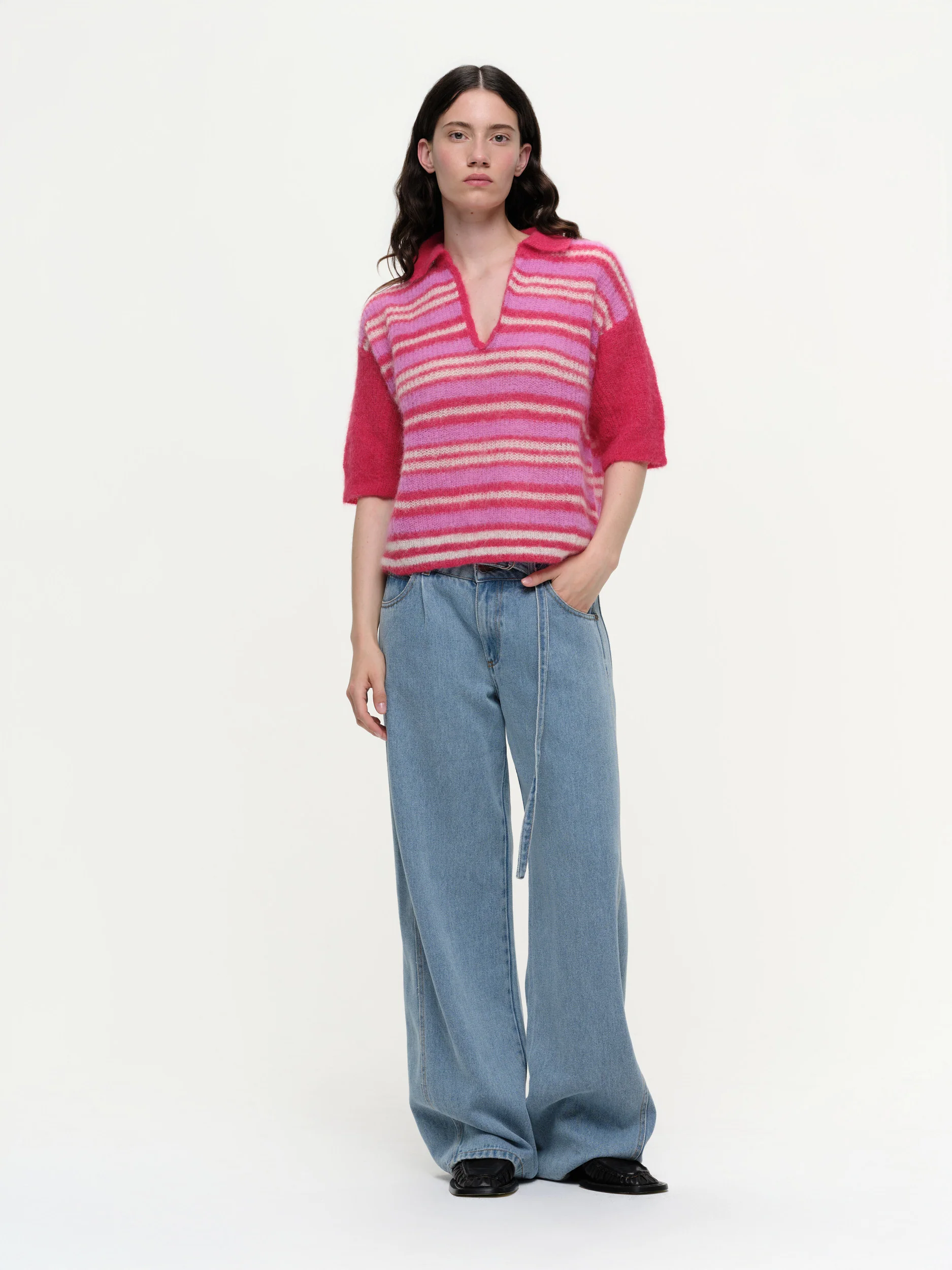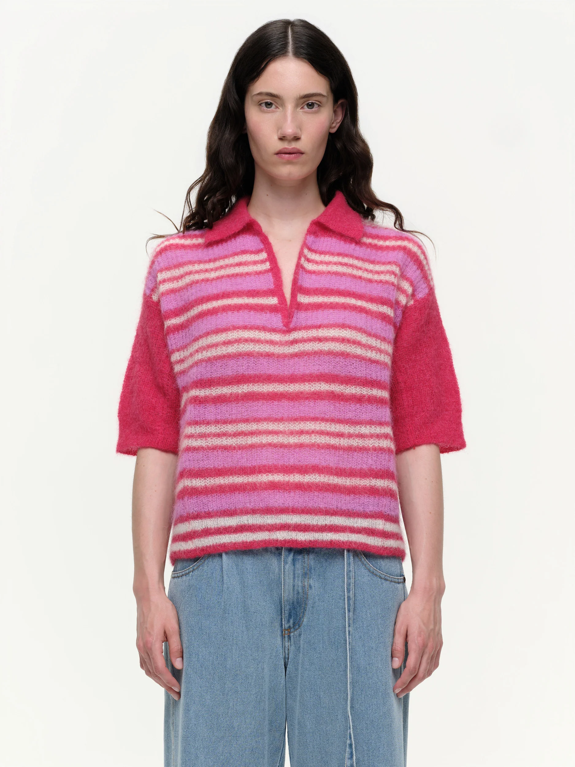 Ce pull ample est confectionné dans un mélange doux de mohair et d’alpaga, avec un tricot ajouré qui lui confère une sensation de légèreté et de fraîcheur. Version estivale du polo Our Sister, il présente un col ouvert et un motif à rayures audacieuses sur tout le corps pour un look frais et affirmé. Avec ses manches courtes, ce modèle facile à porter apporte une touche estivale décontractée et sans effort.