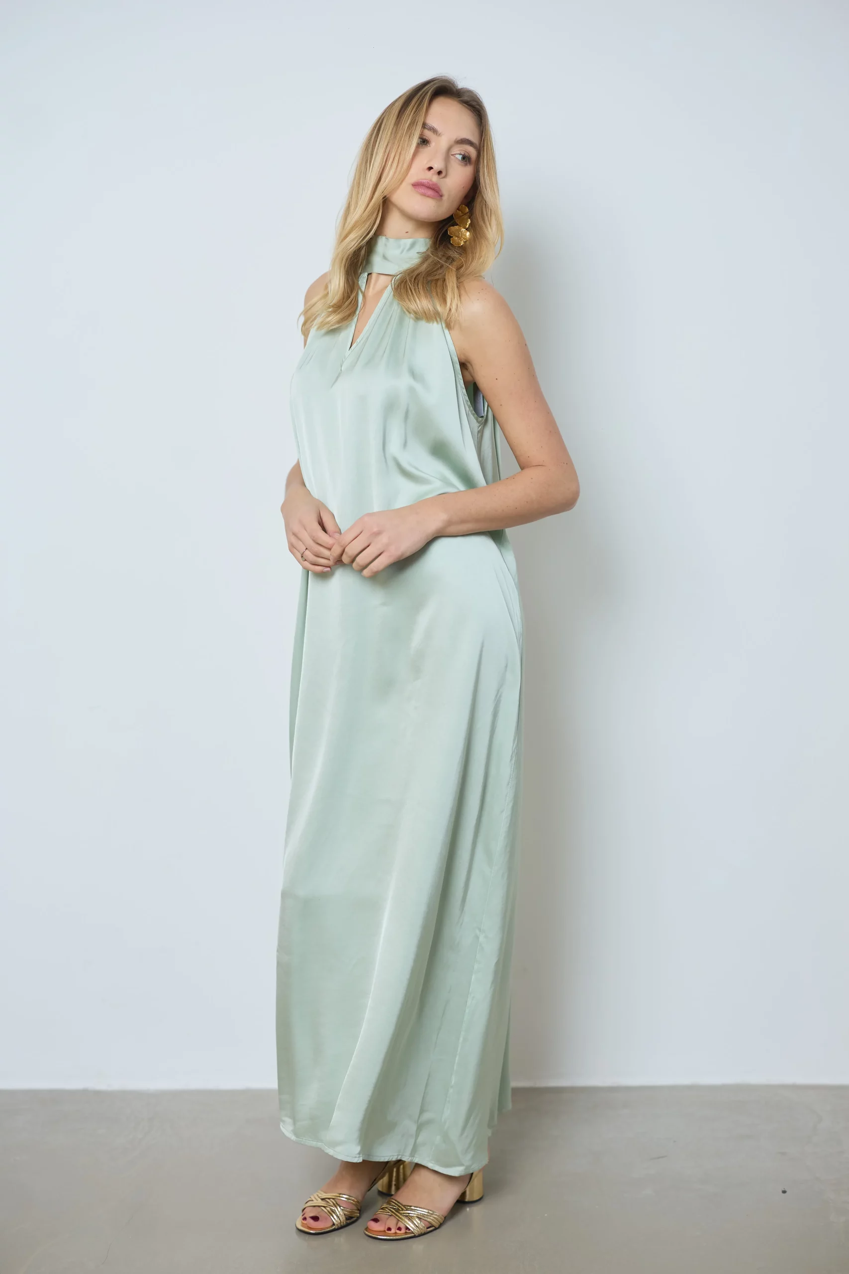 Apportez élégance et légèreté avec la robe Victoria, dérivée de notre meilleure vente. Longue en satin, sans manches, nouée dans le dos et avec une ouverture en V devant pour un style raffiné.